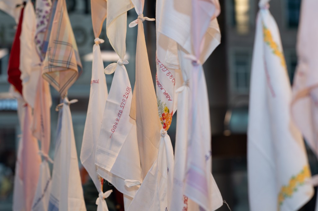 Die im Libanon geborene Künstlerin Abir Kobeissi greift diese Beziehung zwischen Objekt und Subjekt, Taschentuch und Besitzerin oder Besitzer auf. Sie macht aus den einzelnen Tüchern eine vielsagende Installation. Schon der französische Titel (es gibt eine enge persönliche Bindung zur französischen Sprache), übersetzt mit „streichel mich“, bringt eine körperlich-sinnliche Komponente ins Spiel. Er verweist auf das Bedürfnis nach Nähe und Berührung. Diese war in Zeiten der Pandemie strikt eingeschränkt. Der Entzug körperlicher Nähe war und ist nicht nur ein Thema der Geschlechter, er ist universell, was die Schutzmaßnahmen gegen die Verbreitung des Corona-Virus drastisch erfahrbar machte. Das Verknoten der Taschentücher zu Schnüren, die eine Art Vorhang bilden, spricht zugleich vom Verlangen nach Zusammenhalt. Es geht nicht nur um die individuelle Verbindung, sondern ein Miteinander vieler Menschen, ein sprichwörtliches „Verknüpfen“. So wie auf Taschentüchern häufig Initialen gestickt sind, hat Abir Kobeissi ihren Namen und eine Handynummer eingestickt. Mit Caresse-moi gibt die Künstlerin zugleich ein persönliches Statement. Es ist ein Bekenntnis zur menschlichen Nähe und Empathie.