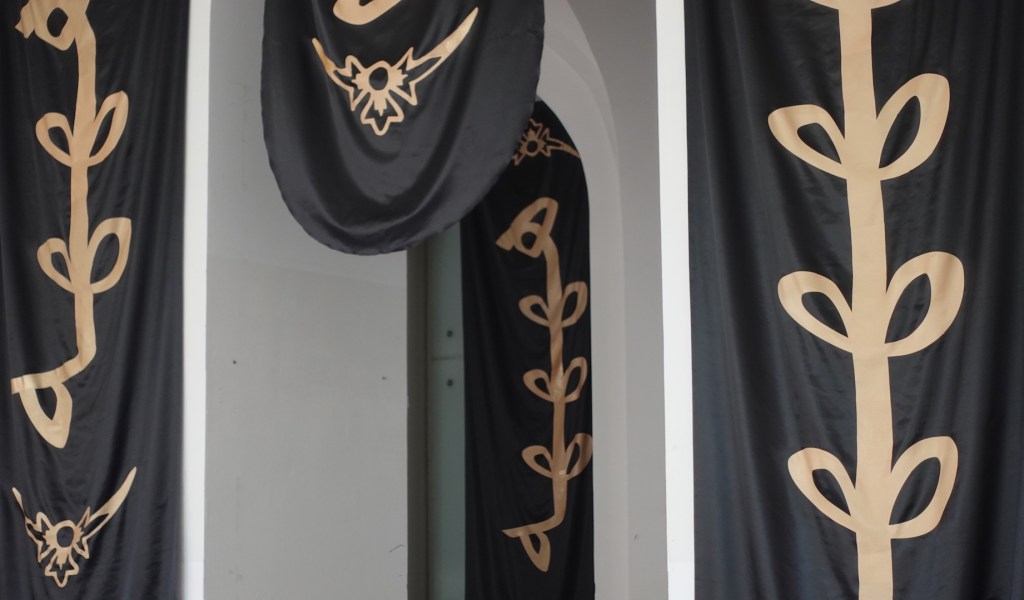 Abir Kobeissis Arbeit „L’AFTER“ ist eine Serie von mit Siebdruck gedruckten Wörtern auf 5 schwarzen Satinbannern, die speziell für den Haupteingang des historischen Gebäudes der Akademie der Bildenden Künste in München für die Jahresausstellung 2022 entwickelt und gedruckt wurden.
